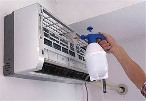 8、使用翅片专业清洗剂均匀喷洒在表冷器上;